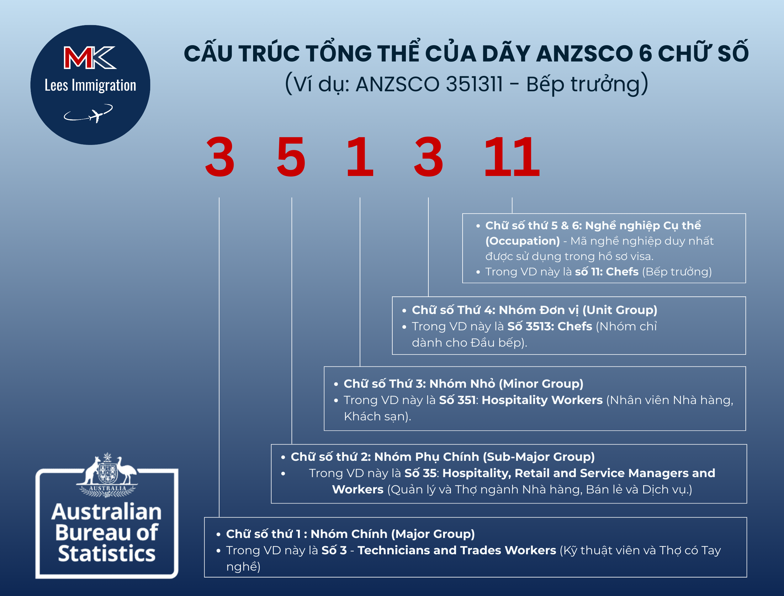 - ANZSCO (Úc): Độc lập và Chi tiết hơn! Cấp độ Kỹ năng không phải là một trong các chữ số trong chuỗi mã ANZSCO 6 chữ số. Chữ số đầu tiên (1 đến 8) chỉ xác định Nhóm Chính (ví dụ: 2 cho Chuyên gia, 3 cho Ngành Nghề) – đây là một phân loại rộng, không phải Cấp độ Kỹ năng cụ thể. Để xác định nghề nghiệp của bạn thuộc Skill Level 1, 2, 3, 4 hay 5, bạn phải tra cứu mô tả chi tiết cho mã 6 chữ số trên trang web của Cục Thống kê Úc (ABS).