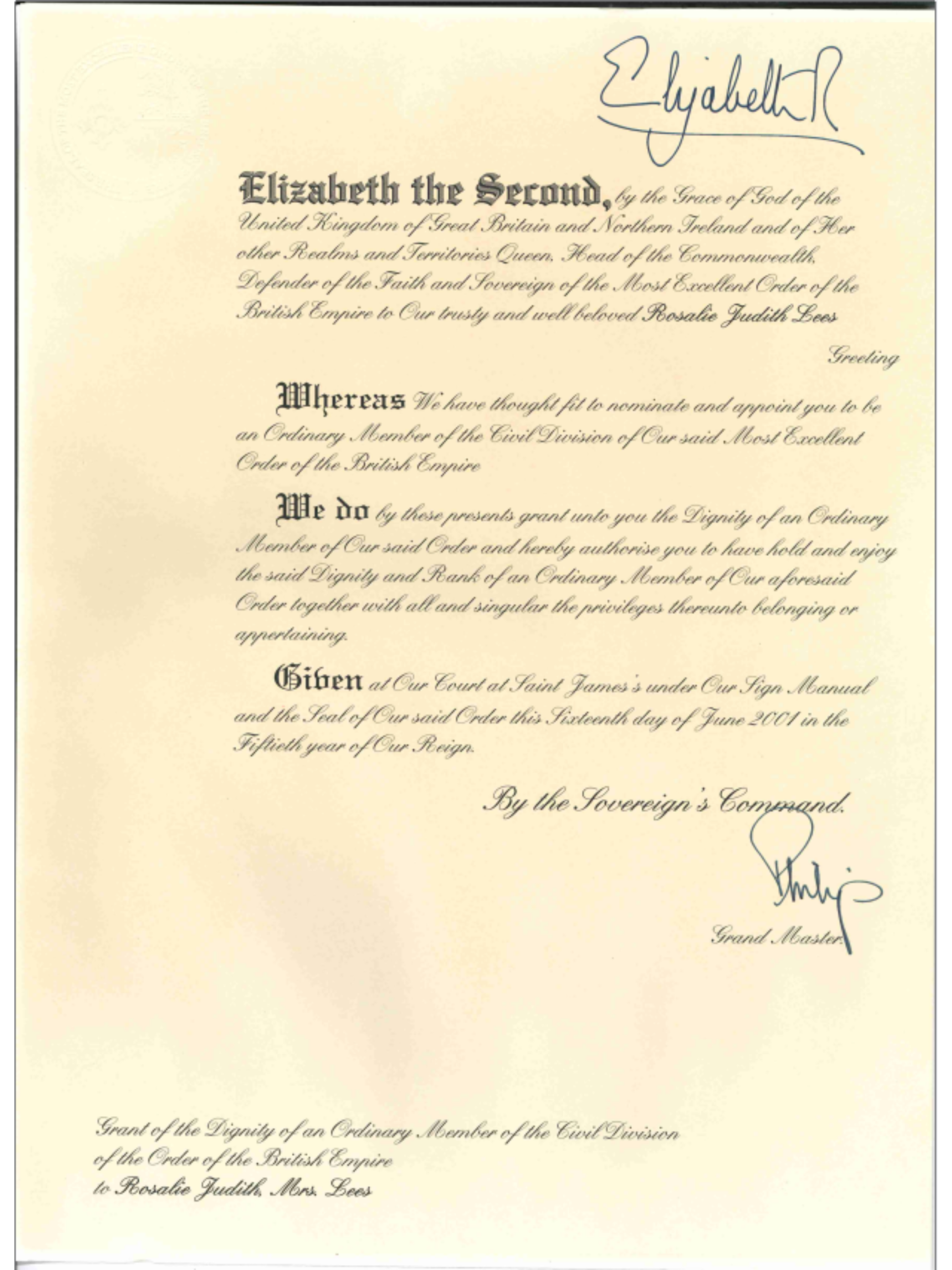 Năm 2001, những đóng góp thầm lặng nhưng phi thường ấy đã được Hoàng gia Anh ghi nhận. Nữ hoàng Elizabeth II đã quyết định trao tặng danh hiệu cao quý MBE (Member of the Order of the British Empire) cho bà Rosalie Lees tại Cung điện Buckingham để vinh danh hành trình phụng sự cộng đồng không mệt mỏi của ông bà.